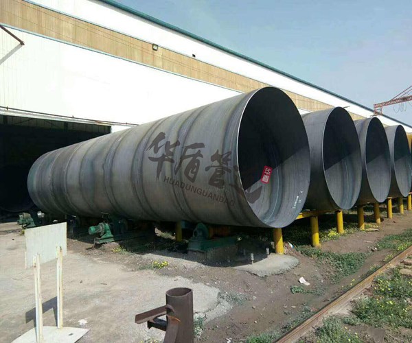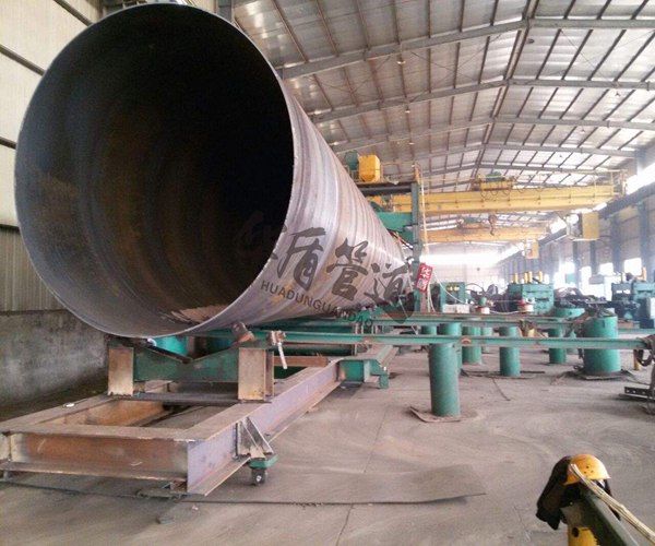 排水用螺旋鋼管是以帶鋼卷板為原材料,經(jīng)常溫擠壓成型,以自動雙絲雙面埋弧焊工藝焊接而成的螺旋縫鋼管。螺旋鋼管將帶鋼送入焊管機(jī)組,經(jīng)多道軋輥滾壓,帶鋼逐漸卷起,形成有開口間隙的圓形管坯,調(diào)整擠壓輥的壓下量,使焊縫間隙控制在1~3mm,并使焊口兩端齊平。